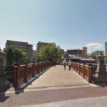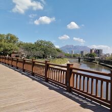 「維新ふるさと館」の前にある甲突川にかかる橋です。歩行者専用の木造橋で欄干親柱の脇には灯籠があり、なんとも風情があります。橋の上からはゆったり流れる甲突川と桜島が眺められとても気持ちのよい場所です。
