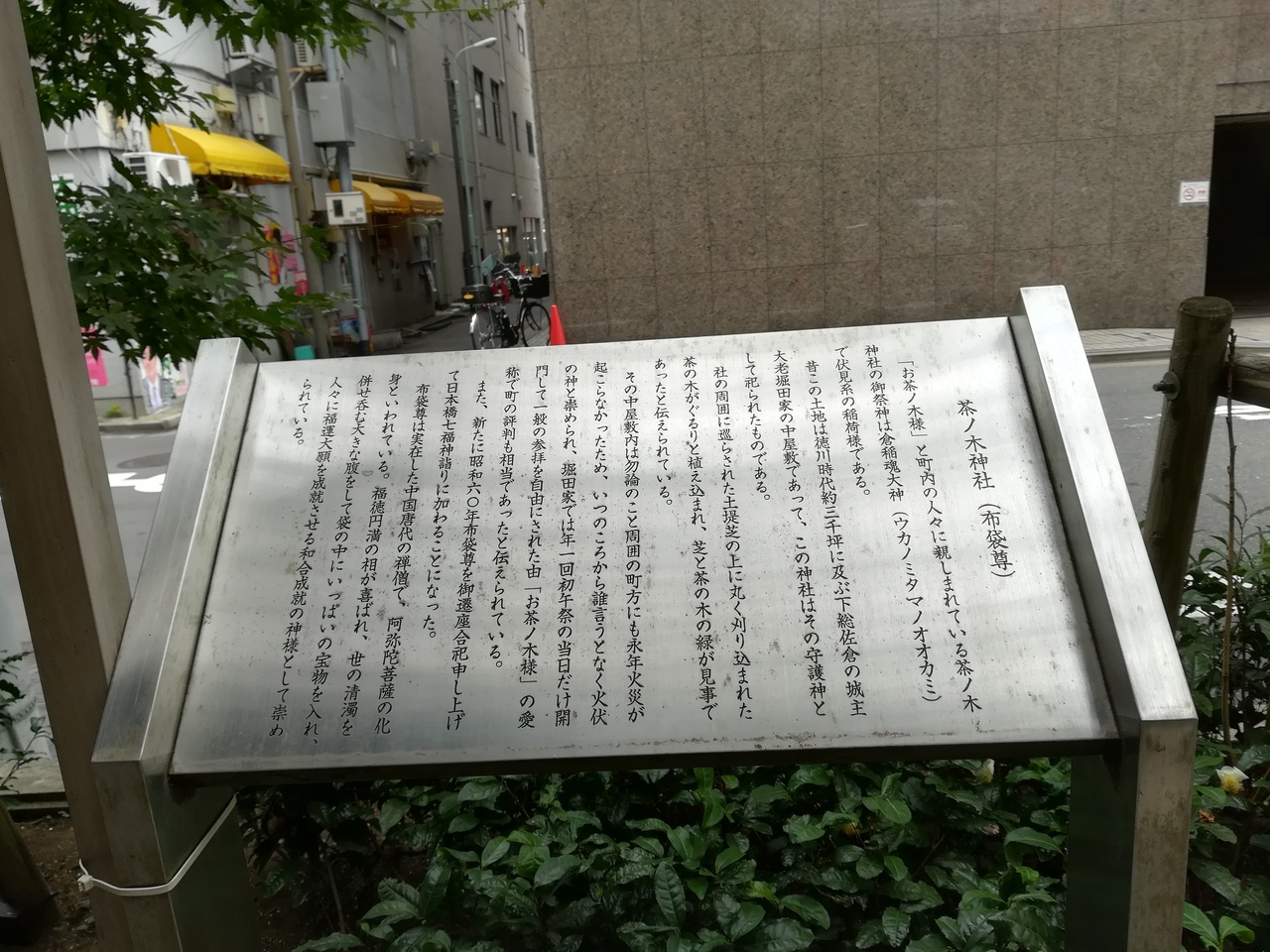 何年か前に、日本橋七福神めぐりをした事がありました。そのひとつの茶ノ木稲荷神社です。日本橋七福神の布袋尊で、愛称は、お茶の木様です。人形町、水天宮から5分位の場所ですが、裏通りにある為、ひっそりとした感じです。