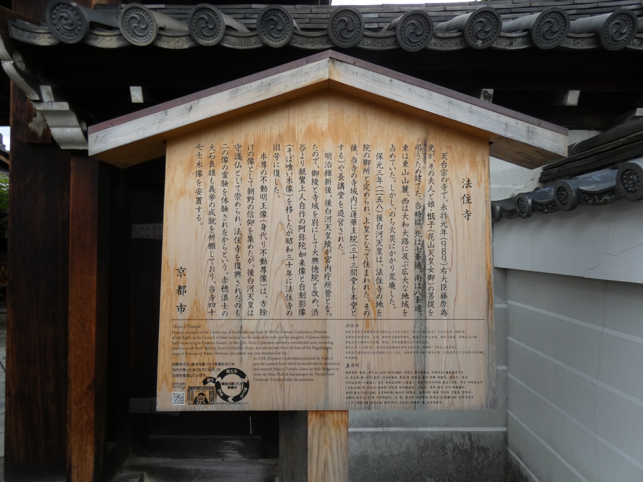 京都三十三間堂の東側に建つ後白河上皇ゆかりの天台宗寺院。平安時代の永延2年(988)藤原為光により創建され、その後院政期に後白河上皇の御所「法住寺殿」が置かれた場所です。上皇が崩御すると隣接の上皇御陵を守る寺として江戸時代末期まで存続し、明治期になって御陵と分離された歴史です。元禄年間には忠臣蔵の大石内蔵助が参拝したと伝わります。