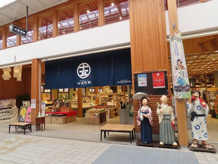 道後温泉の商店街を道後温泉本館へと進み、右折のポイントすぐのところにある、とても明るい感じのお土産屋さんです。入りやすい雰囲気ですね。店頭には坊ちゃんやマドンナの人形が飾ってあり、お菓子も雑貨もいろいろ置いてありました。見るだけでも楽しいお店でした。