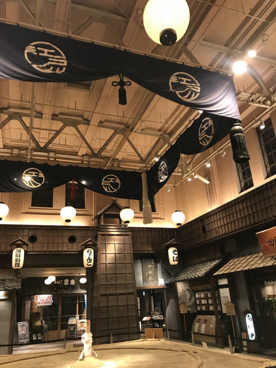 相撲の街らしく、中央には土俵がディスプレイされています。
