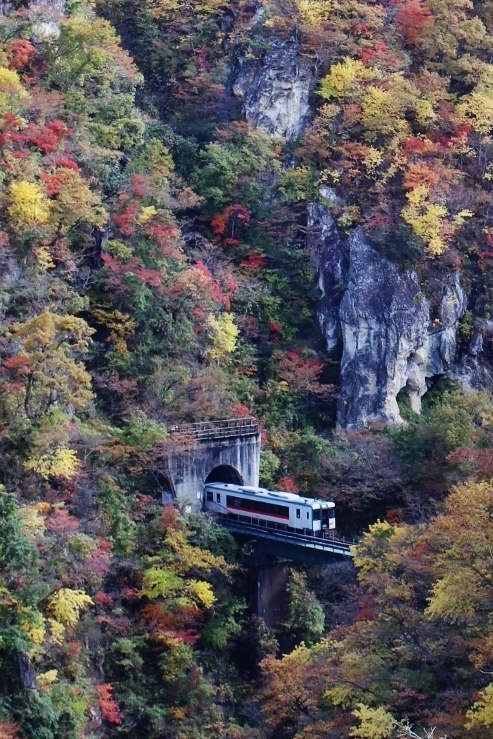 この区間はトンネルが連続するが、トンネルとトンネルの間、渓谷を橋で渡る際に両側に紅葉が見える。