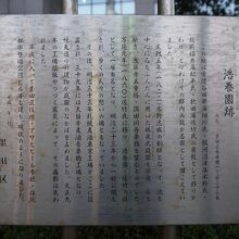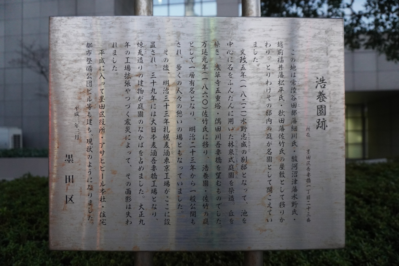 庭園は、文政5年(1822)水野忠成の別邸となって林泉式庭園が造られ、万延元年(1860)には佐竹氏に移り、浩養園・佐竹の庭に。明治期には一般公開もされたようですが、その後、ビール工場が建てられたりして、消滅したようです。