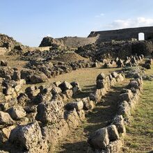朝8時30分から開いているので恩納村から行きました。工事中の多い沖縄の道路は渋滞地点も多く、車線も消えかかっていたり標識も欠落部分有りで分かりやすいアクセスではなかったです。ここが駐車場から入り口まで1番近い城跡。カートで上まで連れて行ってもらい自力で下ってくる時間は1時間30分。城での生活を想像させる跡が1番多く残っていました。