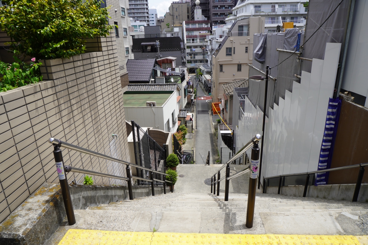 坂の上からは一段低い場所に広がる街並みが眼下に見えて、けっこう急な石段となっています。