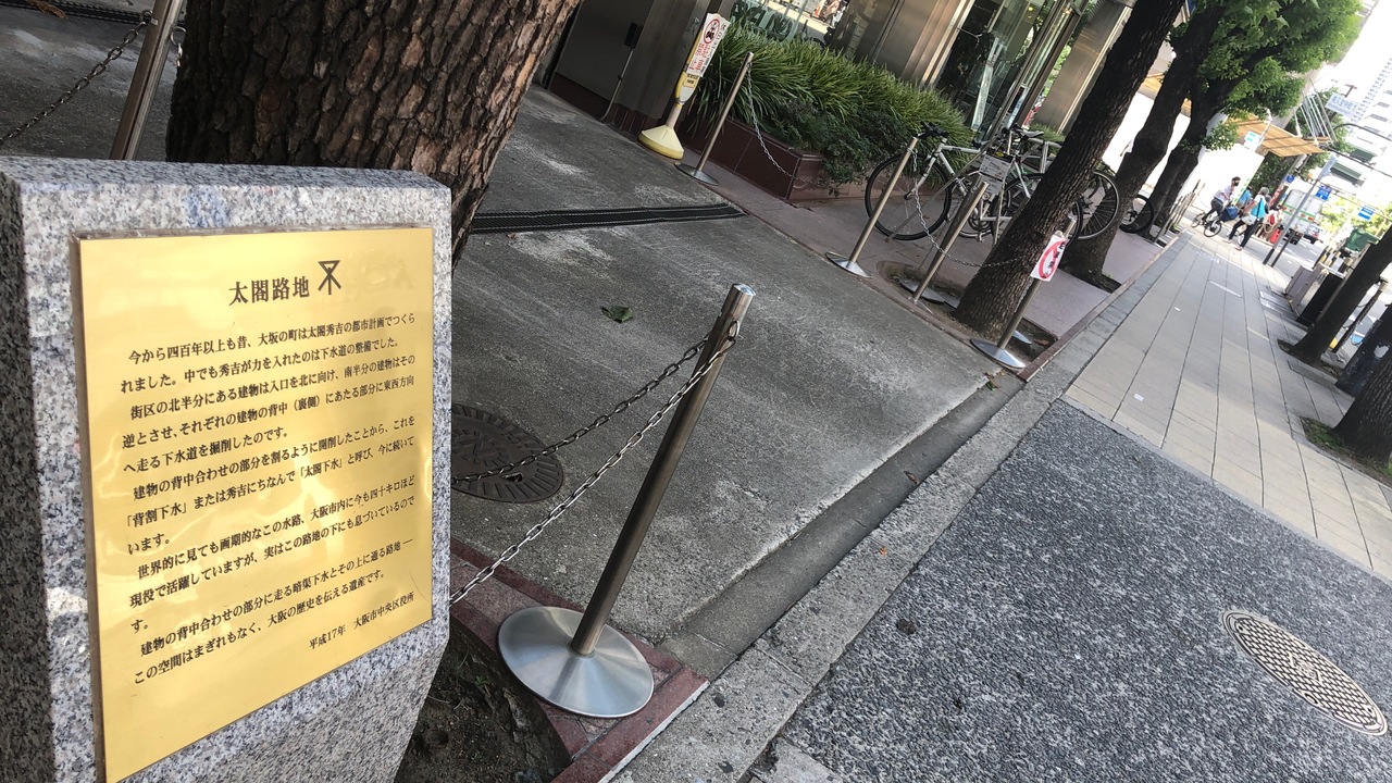堺筋沿いに建つ石碑です。長堀橋駅と堺筋本町駅の中間あたりです。秀吉が大阪市内につくらせた下水道「背割下水」にちなむ石碑です。背割下水とは、建物と建物の間に下水道を通した設備です。秀吉にちなんで、太閤下水とも呼ばれます。