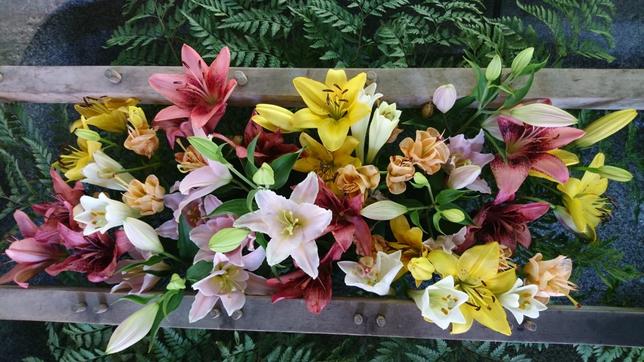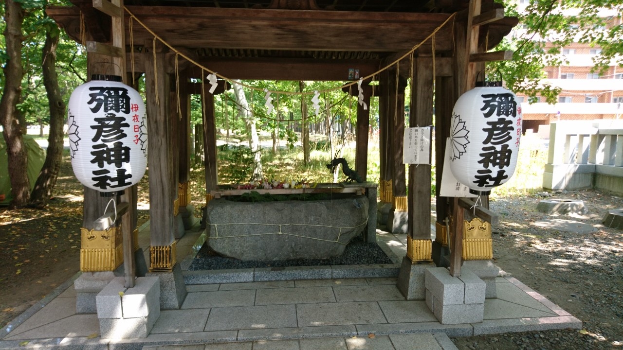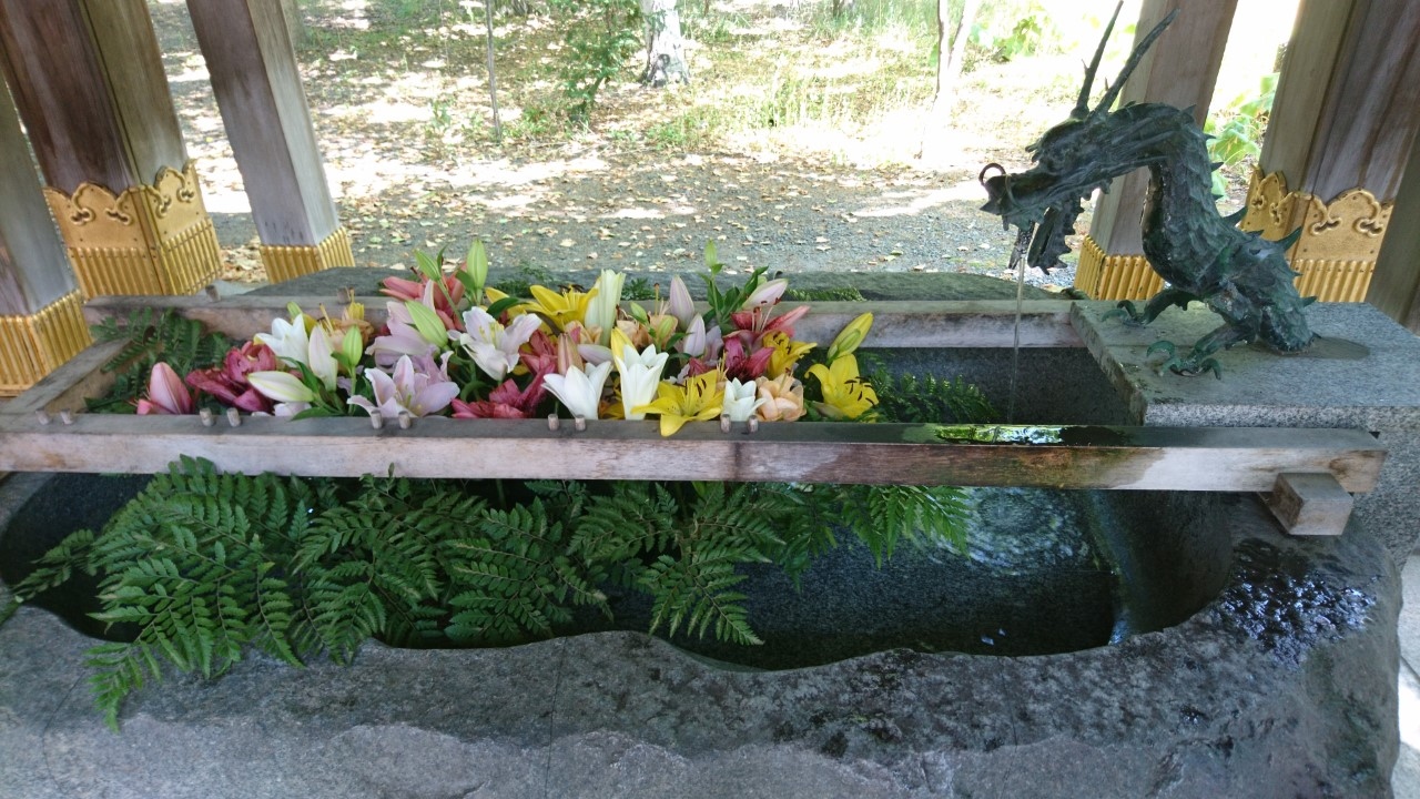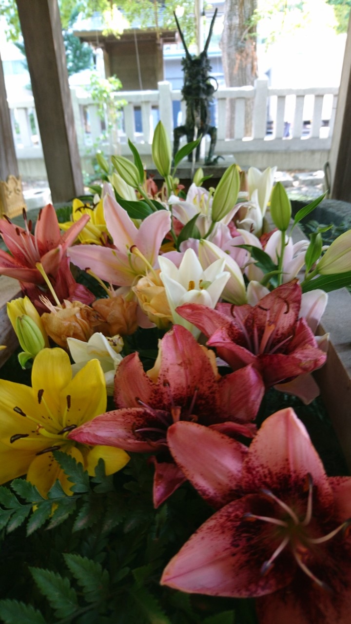 去年、コロナの影響で使わなくなった手水場に花を生ける花手水。今年は彌彦神社さんも加わりました。彌彦神社の手水場は石をくり抜いたような手水場です。そこに生けられた花は、様々な色のユリです。札幌の彌彦神社は、学業に商売繁盛、縁結びに恋愛成就までご利益があるとされています。とてもきれいな神社です。