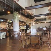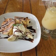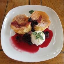 勝沼ICから車で15分ほどのところにある葡萄工房ワイングラス館内の奥にあるカフェです。ふわふわのパンケーキが三種類とドリンクをゆったりした店内やテラス席で注文します。チョコバナナのパンケーキと桃ジュースのドリンクセットと、ベリーソースのパンケーキとコーヒーのセットを頼みました。焼き上がるまで再びワイングラス館内を歩いて、小さなオブジェを選びました。パンケーキはフォーク2本で食べます。しっとりしてふわふわしているのでフォーク2本で簡単に切れました。ソースと生クリームをパンケーキに付けて食べました。パンケーキ生地のメレンゲの味とソースがよく合いました。店の雰囲気とワイングラス館が一体となって、落ち着いてゆっくりパンケーキを楽しめるカフェです。