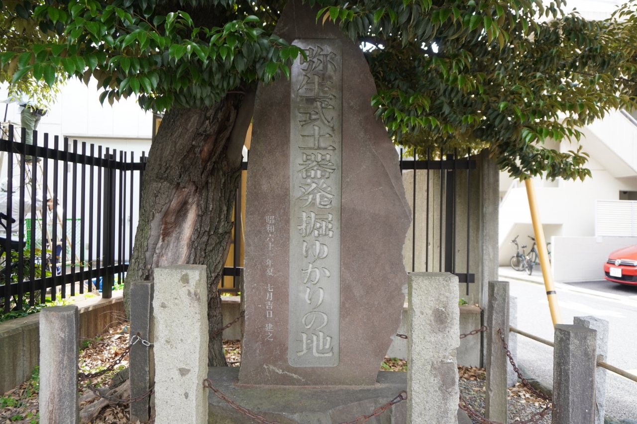 「弥生式土器ゆかりの地」碑は、根津一丁目交差点から弥生坂を上りきった辺り。通り沿いにあって、まあまあ目立つ石碑です。日本に稲作が伝わって以降、縄文時代に代わっての新しい時代である弥生時代を認識させた弥生式土器。日本の古代が学術的に分かってきたのはそう昔のことではないことも含めて、いろいろ考えさせられる重要な石碑だと思います。