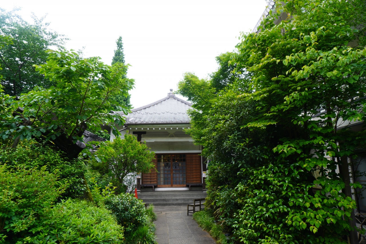 定泉寺は、本駒込駅にも近い本郷通り沿い。石柱の門を入ると奥が本堂。緑の木々の間から簡素な本堂がちょっと隠れ気味に建っていました。元和七年(1621)、本郷弓町にあった太田道灌の矢場跡を旗本蜂屋九郎次郎善遠が拝領し堂宇を建立したのが始まり。本堂前の左側にある六阿弥陀が刻まれた宝篋印塔も見どころです。