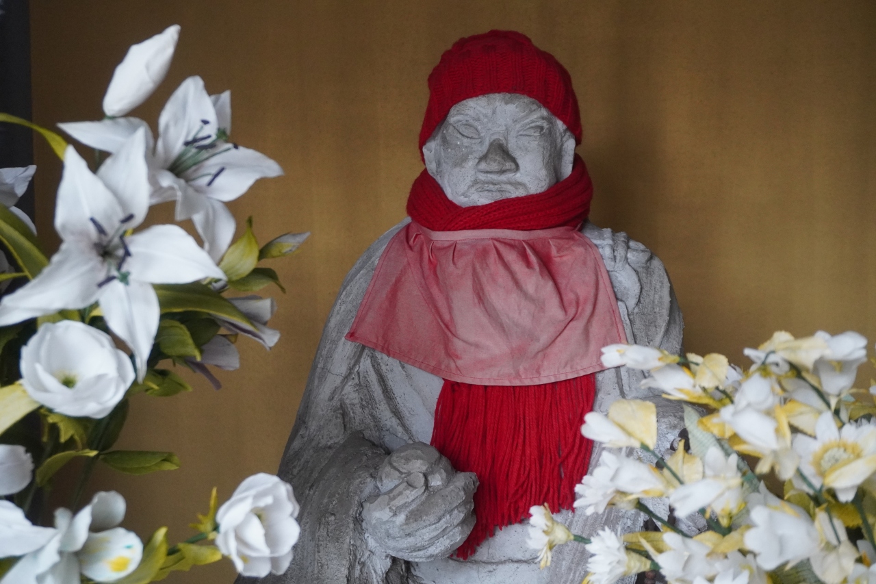 正行寺は、本郷通りに面した浄土宗のお寺。境内にしっかりした立派なお堂があって、とうがらし地蔵という地蔵が祀られています。この地蔵は咳止めの地蔵様。覚宝院という僧が元禄15年(1737年)、この石造を刻んだよう。赤い頭巾をかぶってなかなかの形相です。
