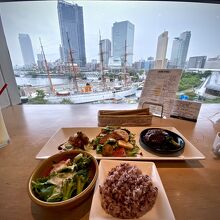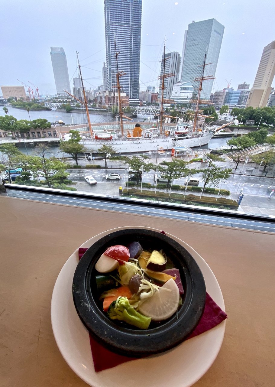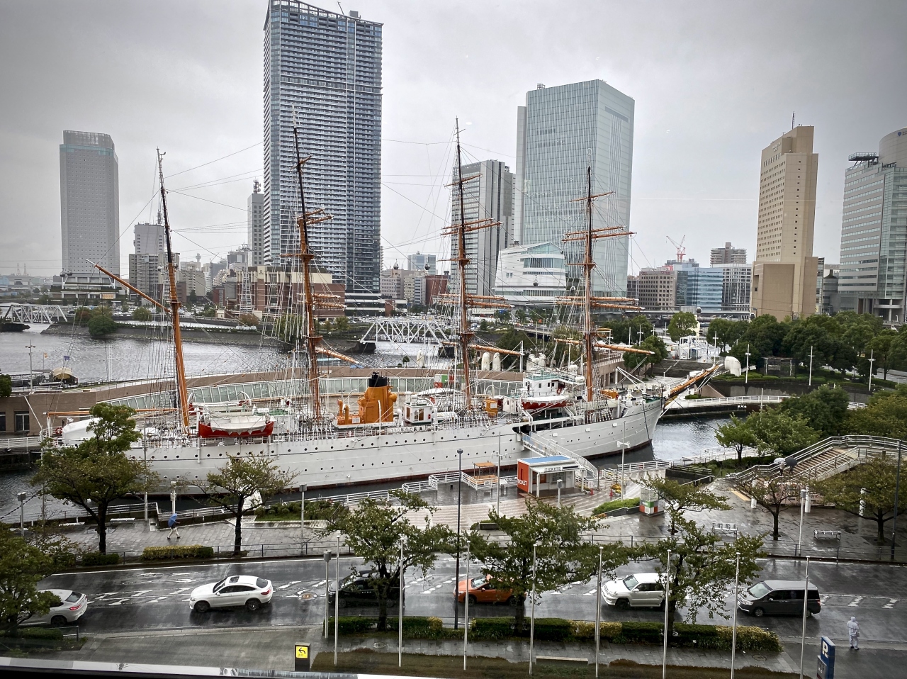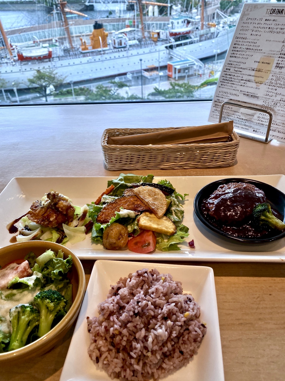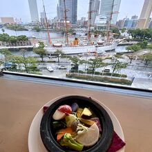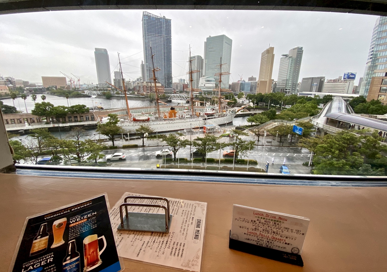私らは、感じの良い店員さんに、窓側に並ぶカウンター席に案内され、すぐ前に「日本丸」を見ながら、目の前に広がるみなとみらいのダイナミックな景色を満喫できました。