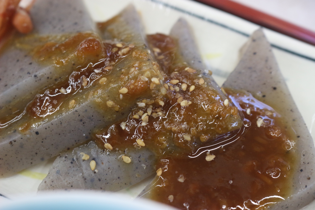 「みそおでん定食」とあったのでおでんが出るかと思ったら、みそのかけたこんにゃくの定食でした。
