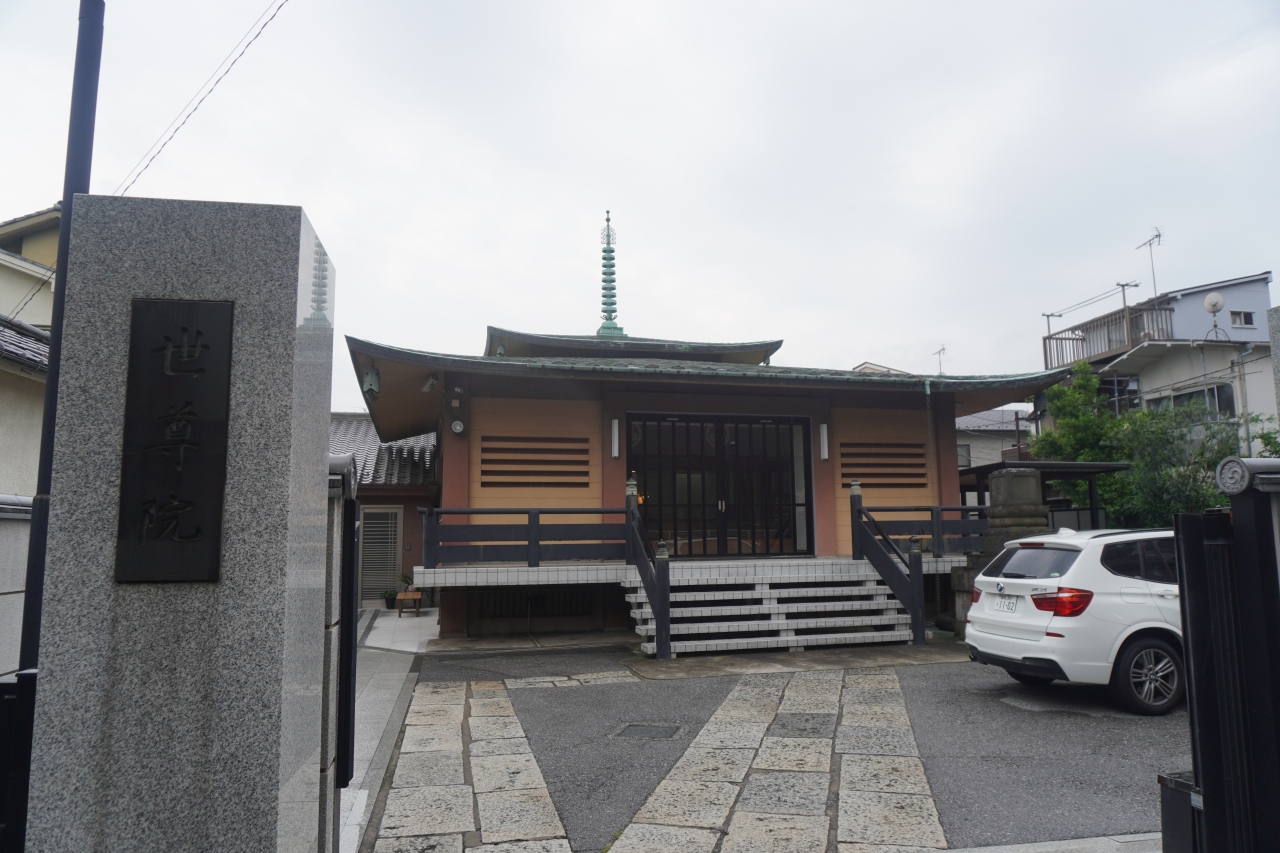 世尊院は、大観音通りから路地を少し入ったところ。五重塔の一層屋根と相輪部分を屋上に頂いた形のよい本堂がなかなか美しくて目を引きます。