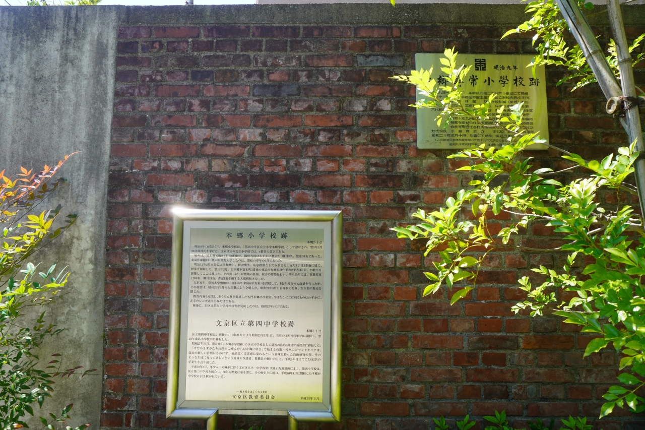 本郷小学校跡は、文京総合体育館の敷地内。一番南側の端っこにレンガの塀と説明版がありました。設立は明治8年6月。第四中学区公立小学本郷学校として認可され、文京区内では4番目の高率小学校だったということです。
