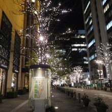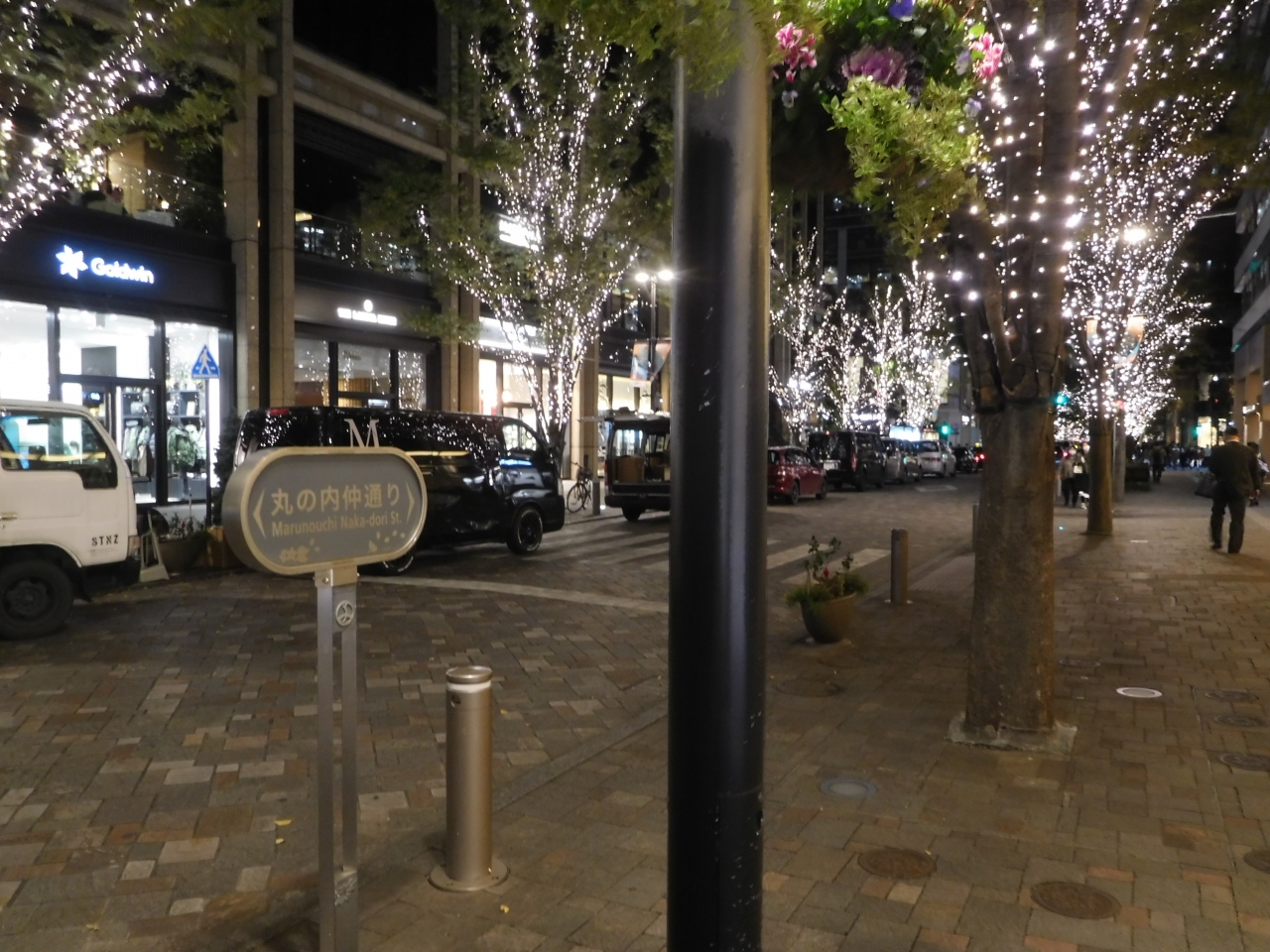 東京駅近くから有楽町駅方面へと真っすぐに続く約1.2kmの道が「丸の内仲通り」となり、11月中旬から始まるシャンパンゴールド色に輝くイルミネーションのスポットとしても有名です。通り沿いの街路樹にはイルミネーションが施され、オフィス街が続く場所でもあるので、とても綺麗に整備されていました。また、アート作品が点在し、ベンチが置かれているので、いろいろな楽しみ方の出来る通りです。