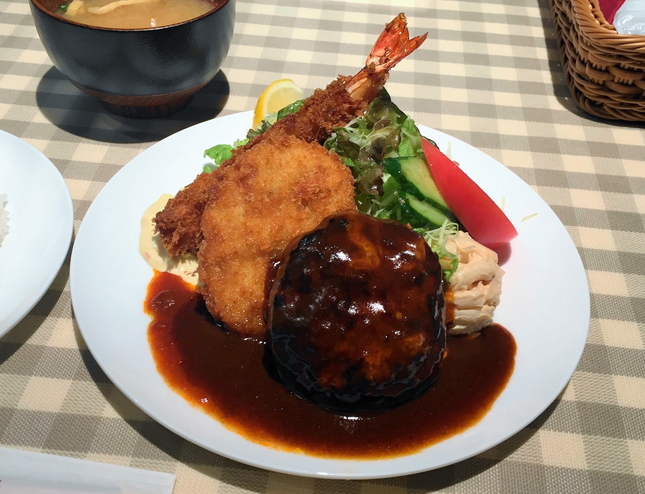 ハンバーグCセットを注文、ハンバーグ・カニクリームコロッケ・エビフライのセットです。
