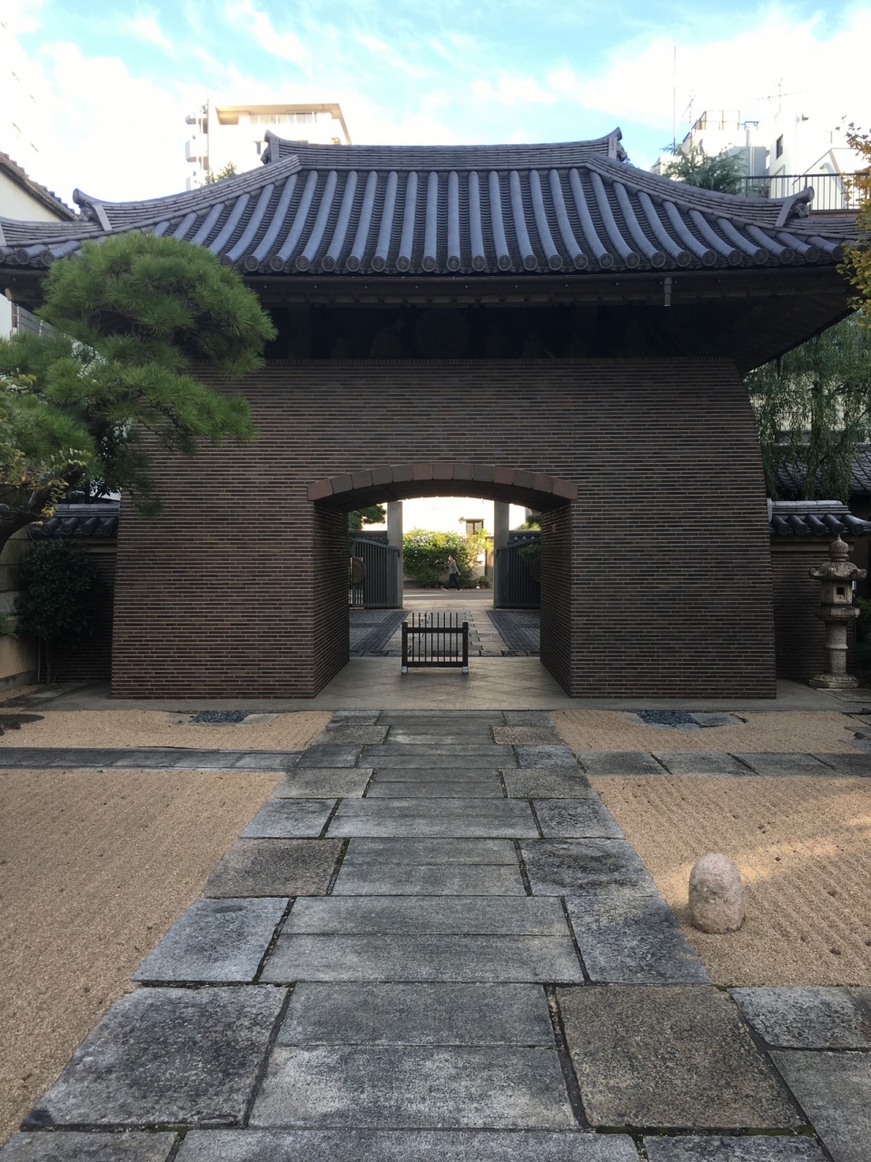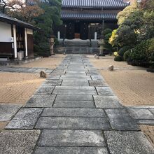 門が素敵で中国様式ぽい綺麗な門でした。門の前は石の道で、門を潜っても石の道が本堂まで伸びていました。庭が綺麗に履かれていて、砂の庭園のような感じで、顔や形が判別出来ない古い地蔵様が屋根の下にありました。