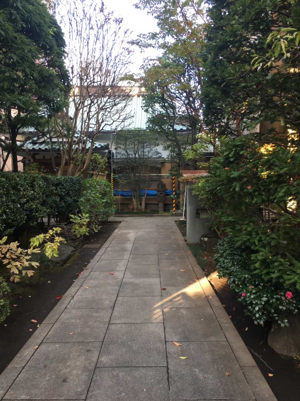 大通り沿いに面した浄土宗のお寺で、石の道の左右には木々が立ち並び、本堂は自宅と兼ねているような建物でした。賽銭箱等はなく、観光寺院ではないため人通りが多いながらひっそりとしていました。木々が多い寺でした。