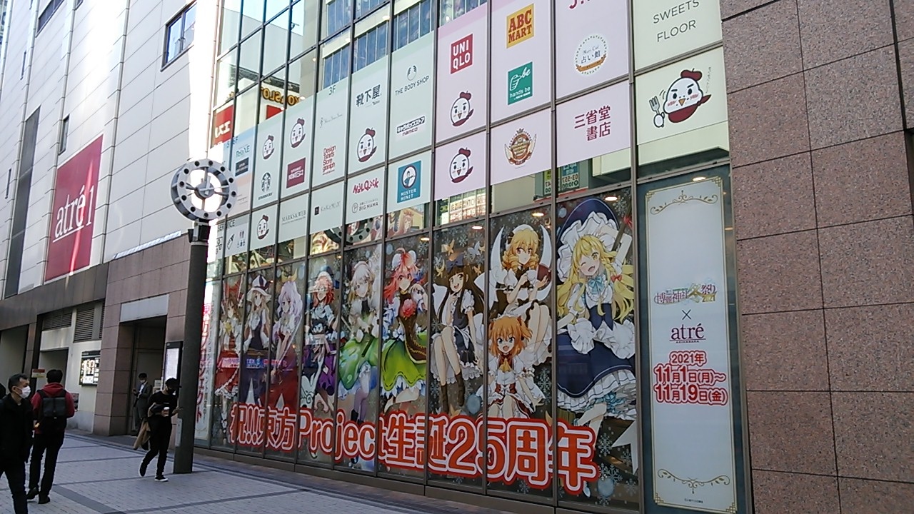 1Fでは駅ビルの外装がアニメ・ゲームのキャラクター(この時は人気ゲーム「東方Project」)なのが目を惹き、2Fより上では「鬼滅の刃」「アイドルマスター」「ウマ娘」など最近人気のアニメ・ゲーム関連のグッズが多数並んでいて、楽しい雰囲気でたっぷりとショッピングができてよかったです。