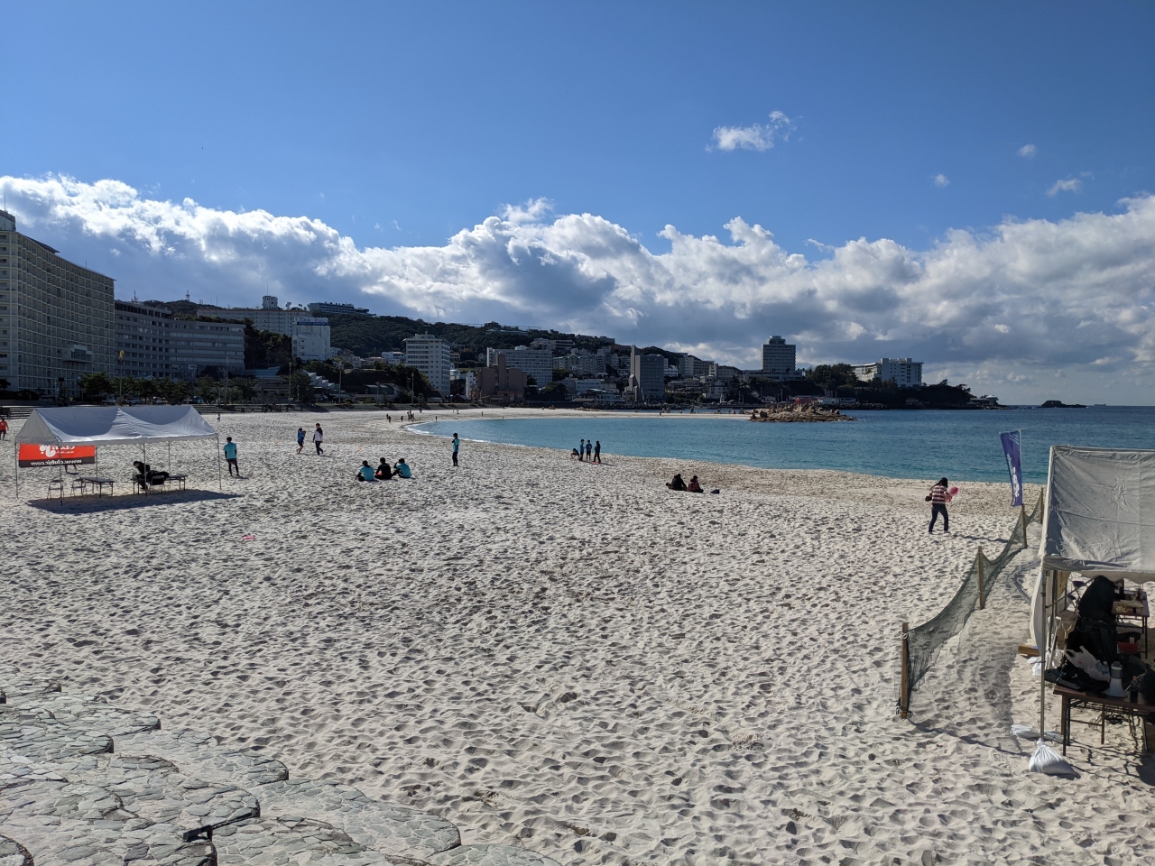 南紀白浜空港から若干15分程度でアクセスできるその名の通り白い砂浜が美しいビーチ。本州なのに何やら南国のにおいが漂い、とてもいい感じ。11月の晩秋でもリゾート感漂い、もはやハワイはいらない!?と思ってしまった。