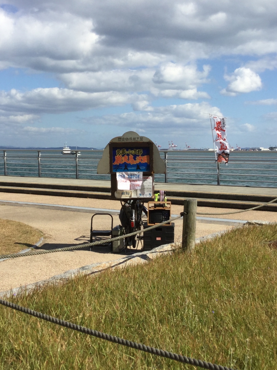 義経と知盛像が見えるとそこが、みもすそ川公園です。10分ぐらいの紙芝居が10:00-15:00の間で行われています。人が集まり次第だそうです。待ち合わせに少し聞こえましたが関門海峡の近くで歴史を聴けるのはとてもいいなと思いました。また7歳まで下関で過ごされた松本清張の文学碑があります。