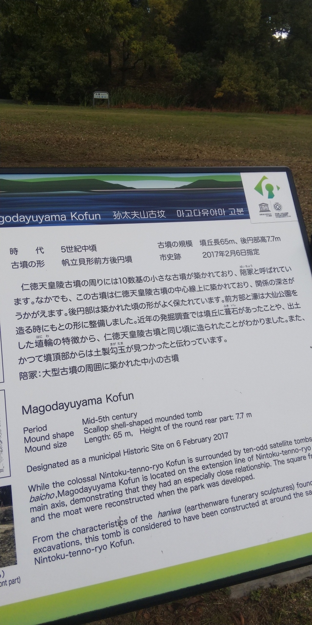 孫太夫山古墳は堺市の仁徳天皇陵古墳の陪冢古墳です。大仙公園内の堺市博物館の前にあり、案内板などもあるのでわりと見つけやすいと思います。大阪の緊急事態宣言も終わったので、少しずつ地図など持っている観光客が増えてきました。