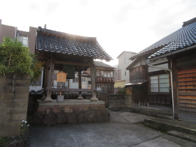 小さなお寺ですが、金沢市指定文化財でもある梵鐘で有名です。加賀藩に仕えた鋳物師の宮崎彦九郎の作品で、銅合金の美しい梵鐘です。こちらのお寺は、観光客も少なく、このひっそりと佇む梵鐘をゆっくり鑑賞できました。