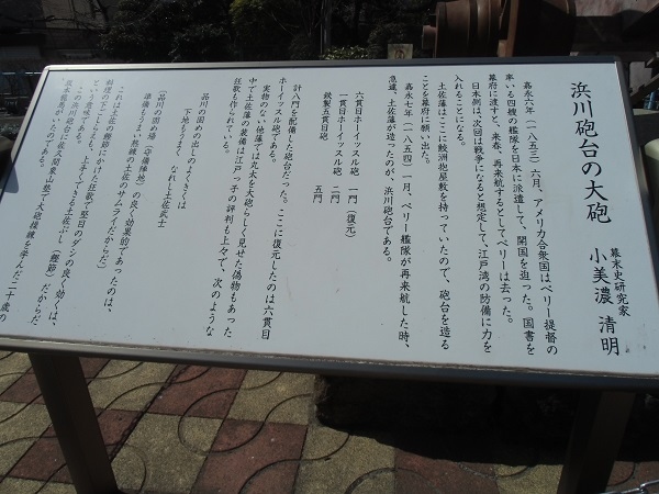 説明板によると、嘉永7年(1854)、ペリーが再来航した時、急遽土佐藩が設置したのが浜川砲台です。