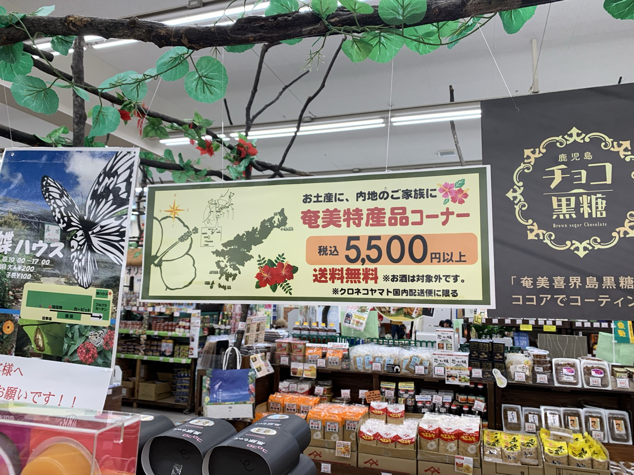 奄美空港から車で25分ぐらい。どでかい施設なのですぐに分かります。なんでも揃うホームセンターですね。食品やお土産もあります。お土産は税込み5500円以上で送料無料です。ただし酒類は含まいので要注意。100円ショップのコーナーもあるので、旅行の忘れ物があってもここで何でも揃います。