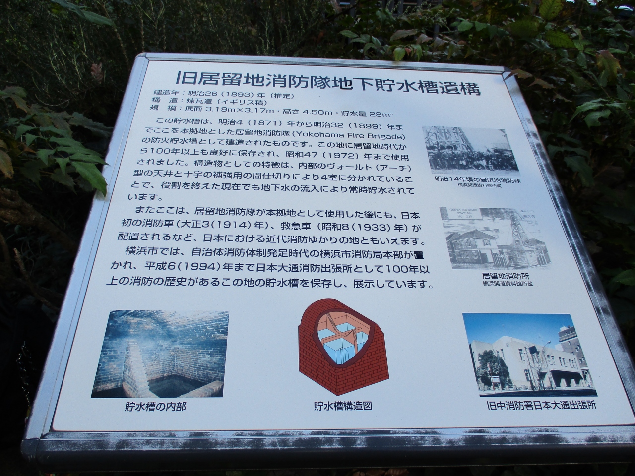日本大通り近辺を散策していて、通り沿いに遺構がそこだけ囲われて残されていました。明治初期に造られた消火用の貯水槽でした。ガラス越しに覗き込むことが出来ました。当時から火災に備えて地下水槽があったとは、さすが外人居留地だけのことがあって、防災意識が高かったことに感心させられました。