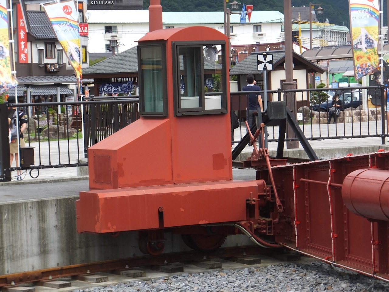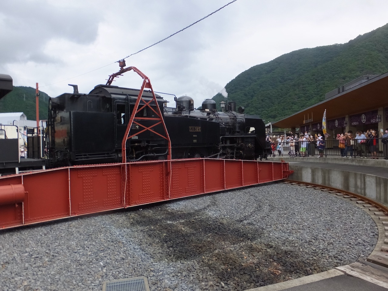 転車台はSLの方向転換のための装置。なので普通は駅裏にあるのですが、ここでは観光の目玉なので駅前広場まで引込線を作って駅前広場でSLを回転させるという素晴らしいショーが1日に2〜4回見ることができます。転車台にSLが来る時間は駅舎に案内がありますし、放送が入るので居合わせた場合はぜひとも。SLは時計回りに駅舎側が頭が来るように回転します。転車台はほぼ360度眺められますが、駅舎側にいるのが迫力ある汽笛が目の前で聴けるので吉、です。