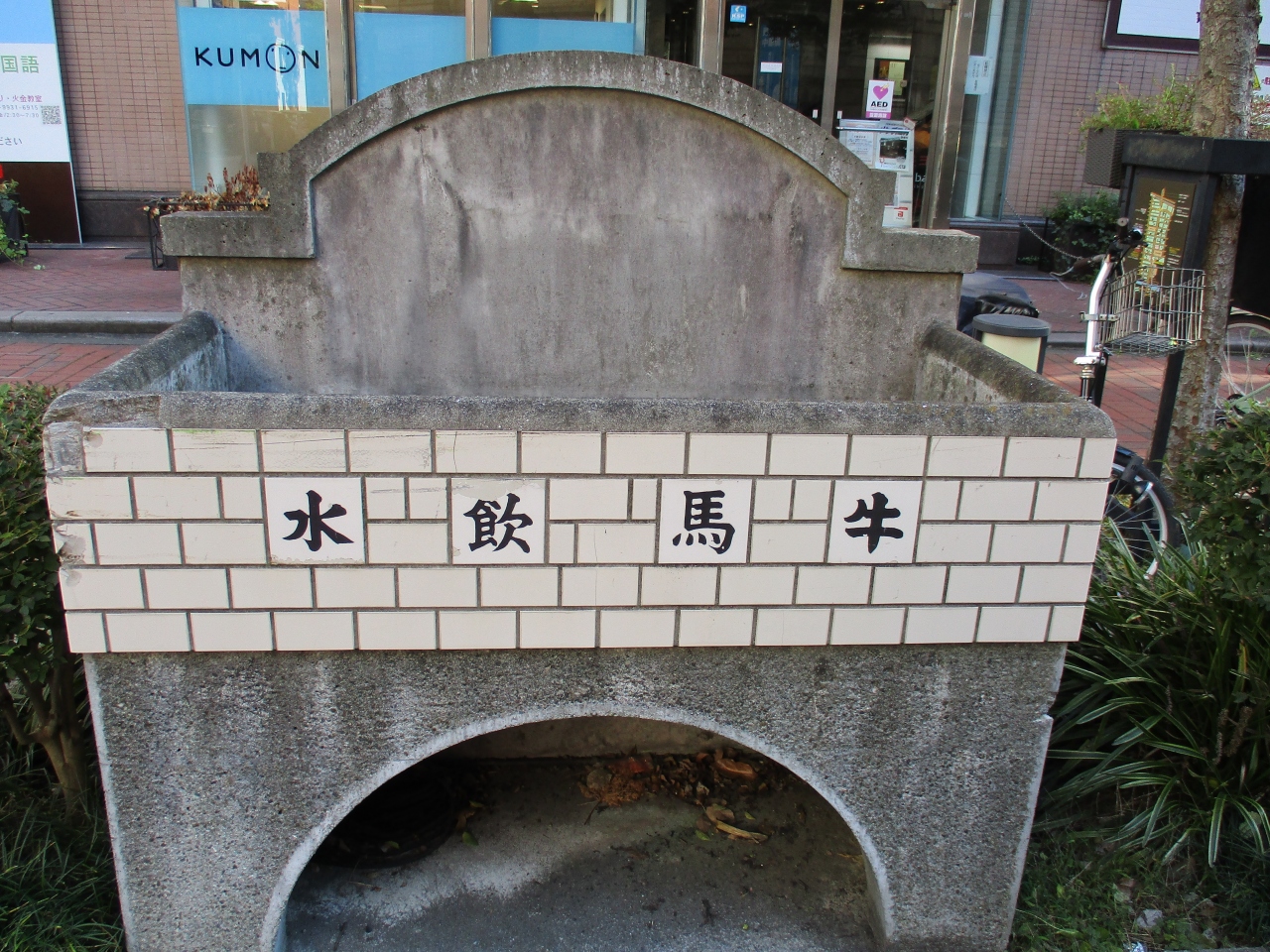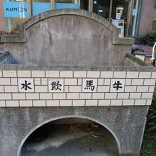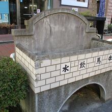 馬車道を散策していた時に、牛馬飲水と右から左方向に書かれたコンクリートとタイル貼りの場所がありました。この通りが昔、馬や牛が通行していて、水を与える場所だったようです。馬がここに首を突っ込んで水を飲む姿が、なんとなく想像できて面白かったです。