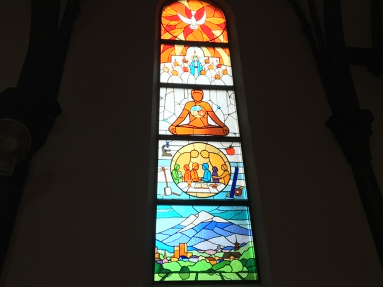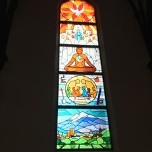 日本の教会が大好きです。この教会はステンドグラスがあり、気になっていました。よく見たら、右側いちばん手前のステンドグラスに岩木山の絵がはいっていて、弘前らしくて気に入りました。また、畳と座布団があるのも渋くて良いです。