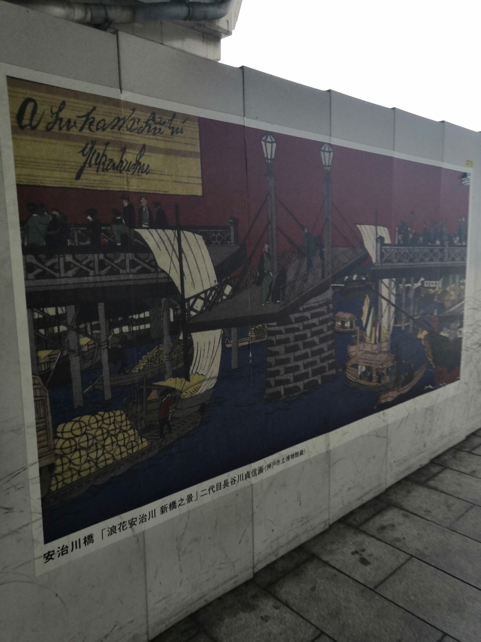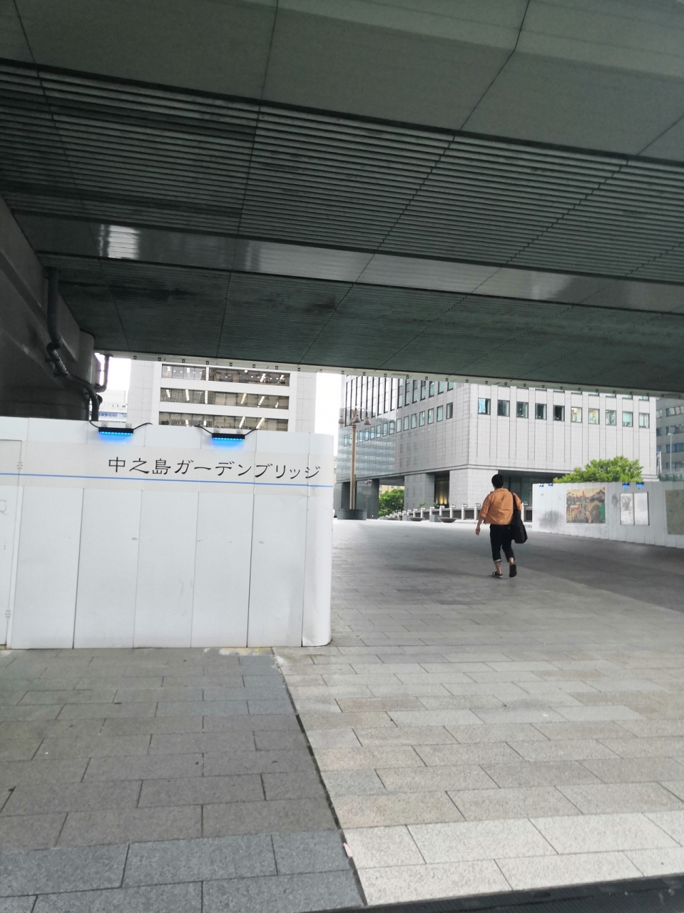 大江橋と渡辺橋という幹線道路に架かる橋の中間にあります。こちらは車が通らないので落ち着いて渡ることができます。橋の両側には大阪の橋についての説明や、途中には彫刻もあったりして悪くない工夫がされていると思いました。