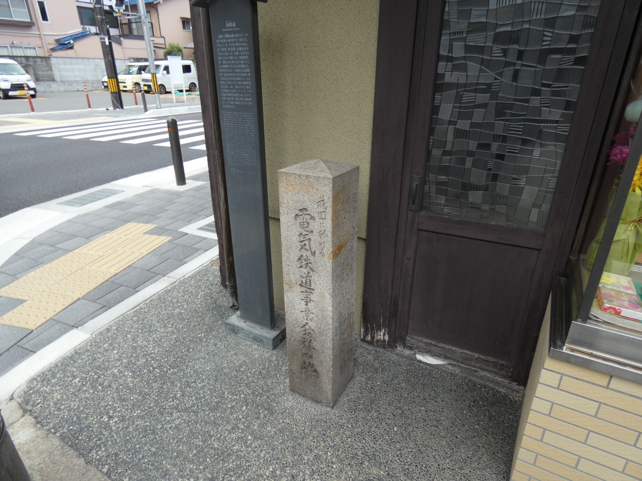 日本有数の酒処で川の町・伏見の油掛通りに面した和菓子店駿河屋本店前に建つ小さな石碑が電気鉄道事業発祥地碑です。明治28年(1895)我が国で初めて走った電気鉄道が此処から京都下京区東洞院通塩小路迄の約6.4㎞の路面電車だったそうです。京都駅前塩小路にも石碑があるようです。