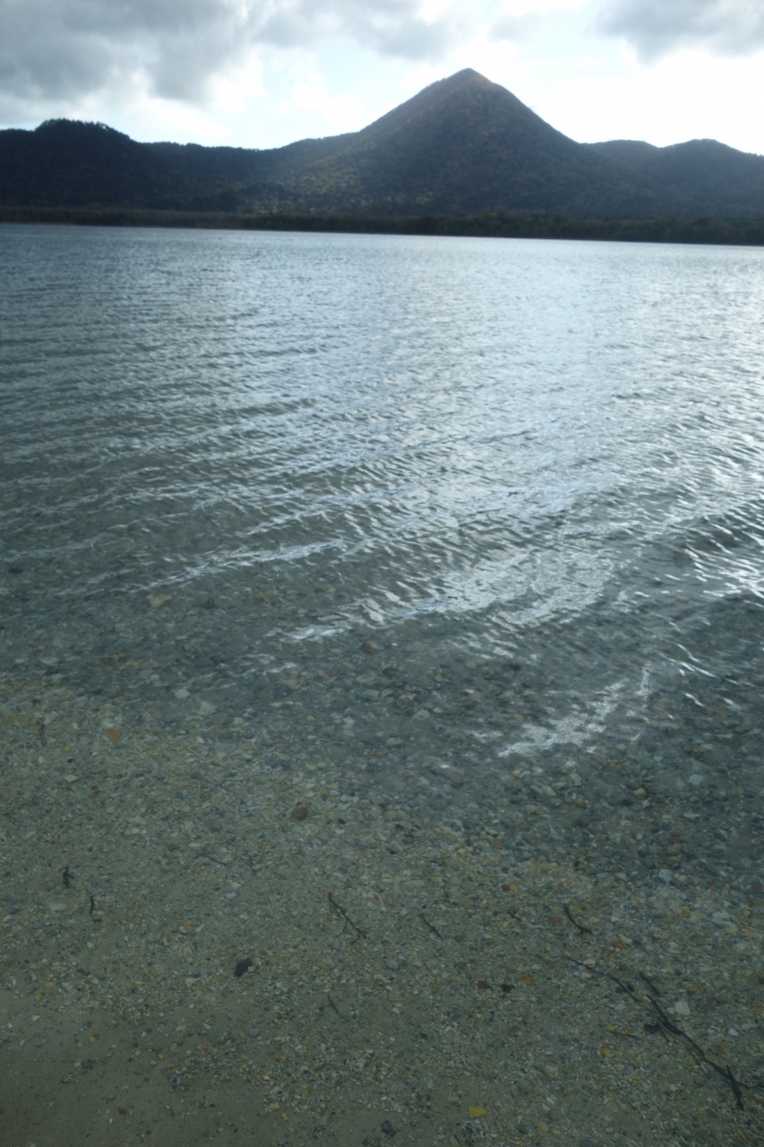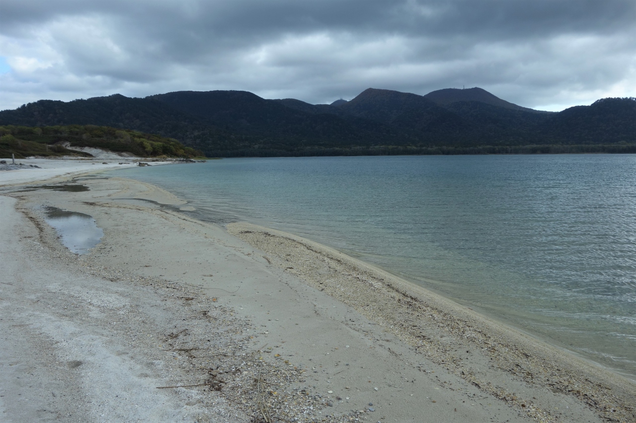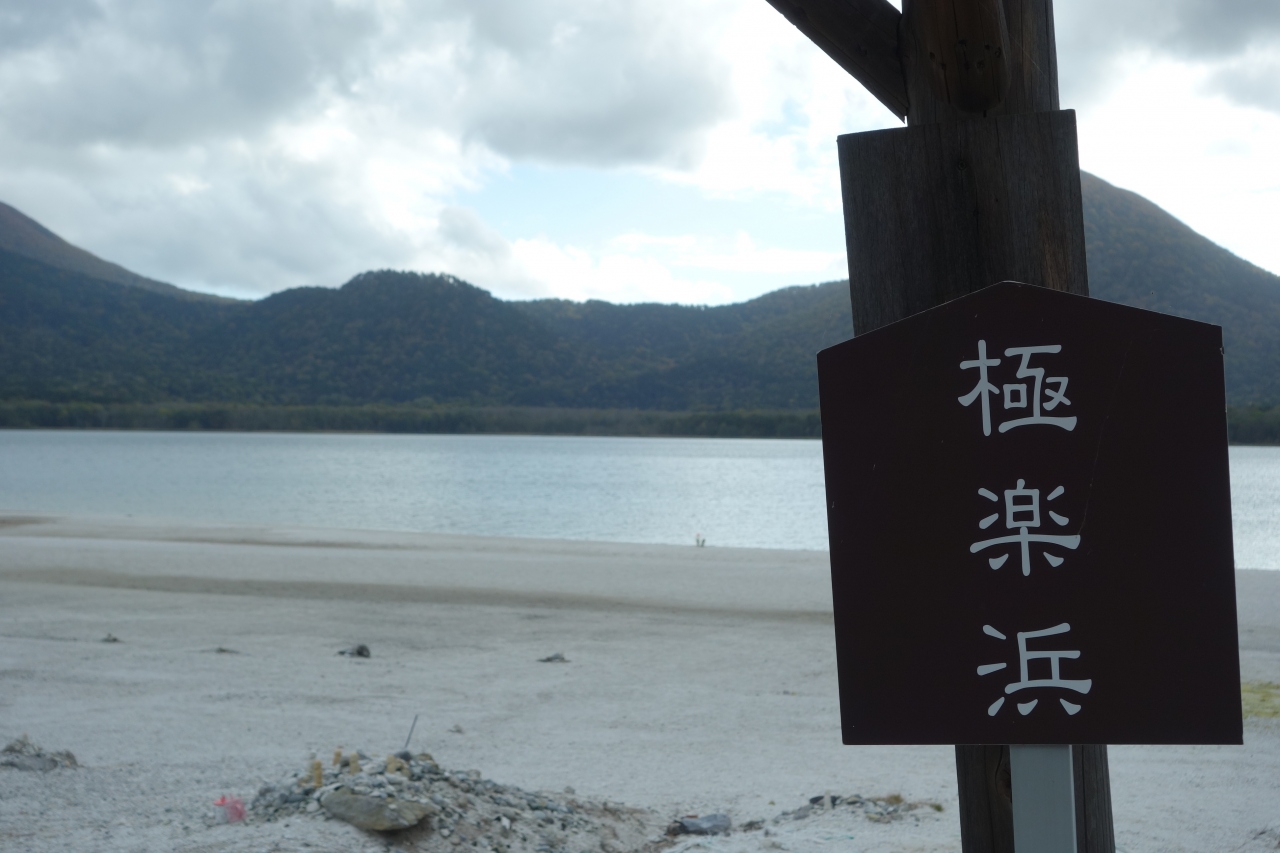 境内の地獄巡りと呼ばれる硫黄の臭う岩だらけの散策路を抜けた先が、極楽浜と呼ばれる宇曽利山湖の水辺になります。火山ゆえ、湖水の酸性度が高く、植物や動物が生息出来ないせいで、水の透明度が高いのだそうです。