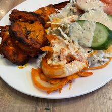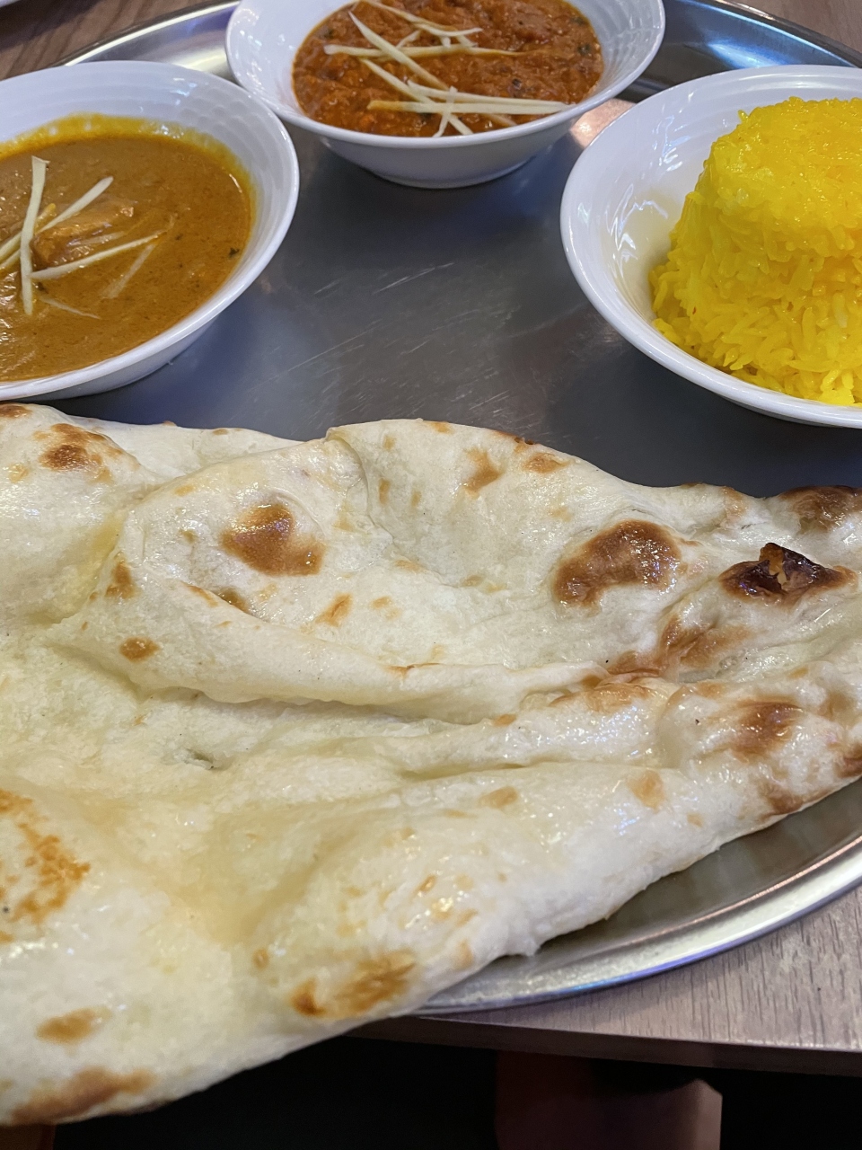 新宿ワシントンホテルレストラン街。店内は広く、テーブル席のみです。スペシャルディナーセットは、カレー二種類、ナン、サフランライス、サラダ、チキンとエビの焼き物がついて、1800円ほどでした。どれも美味しく、ボリューム満点でした。会計は後払いで、QRコード決済が使えました。
