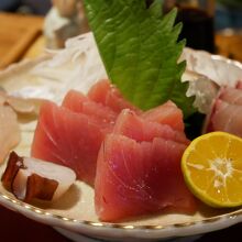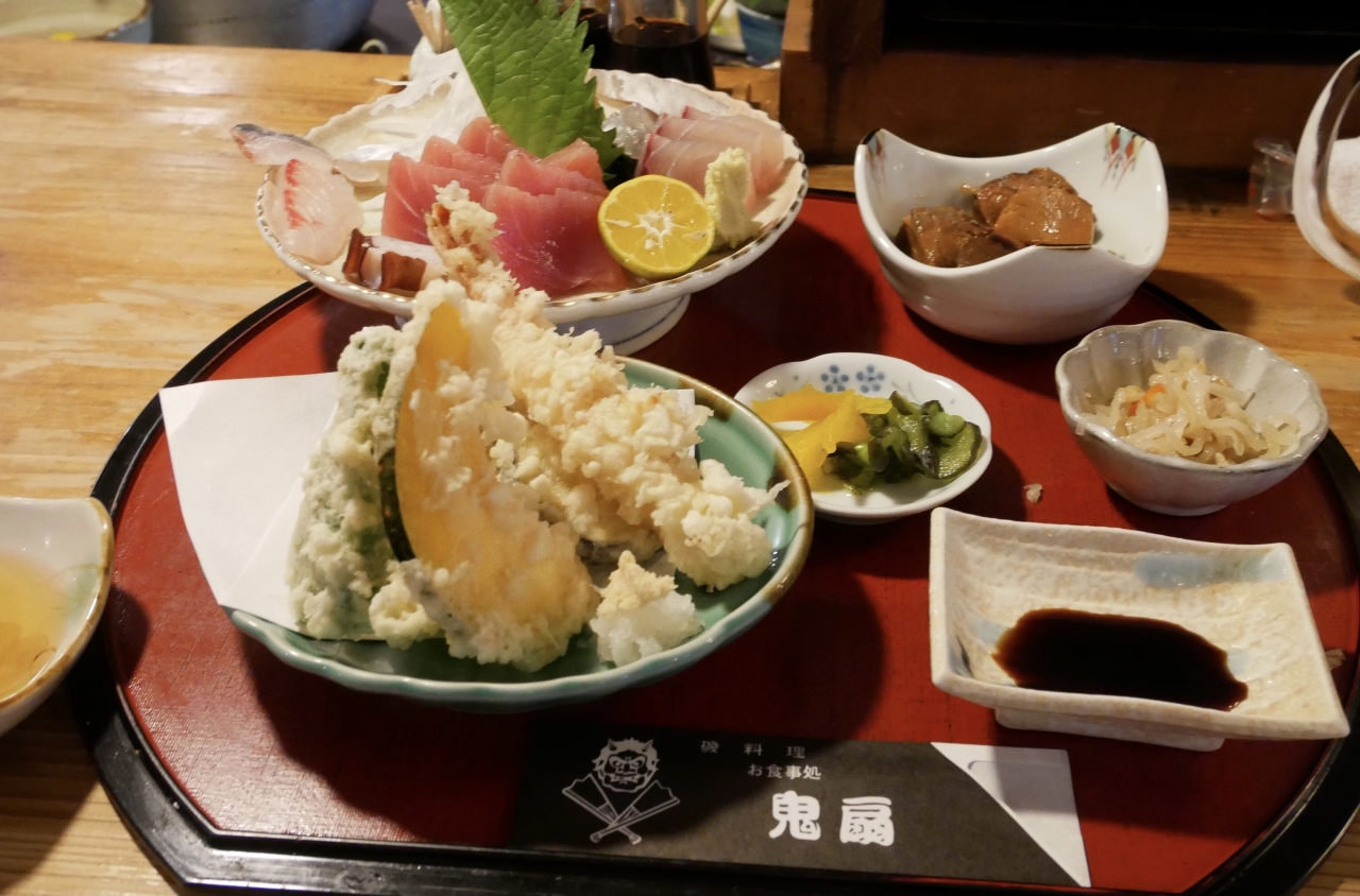 小鉢、アラ煮、天麩羅盛り合わせ、刺身7点盛り