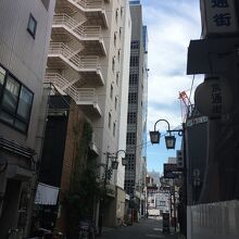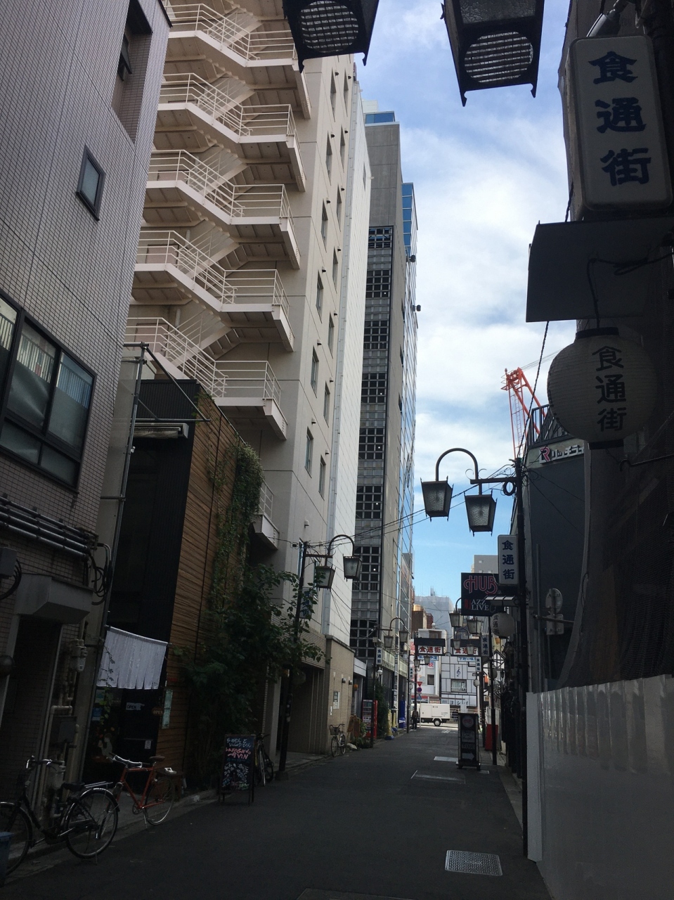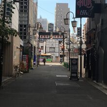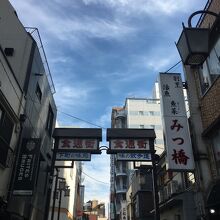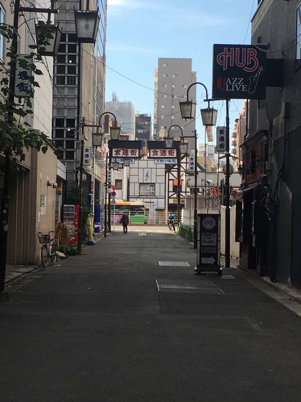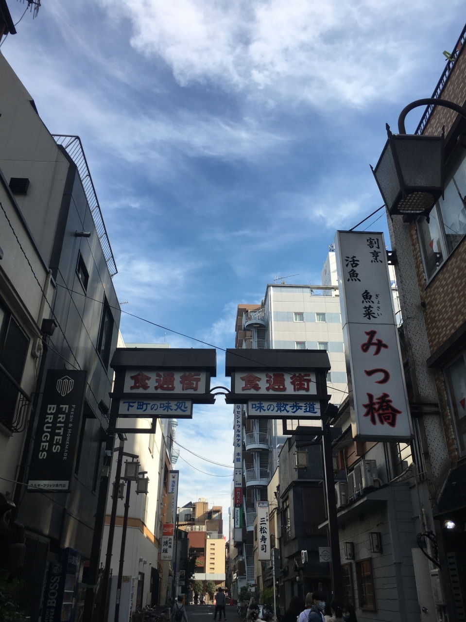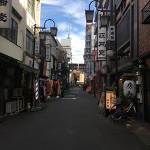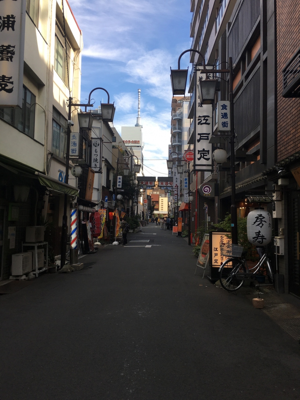 食べ物屋が並んでいましたが、周辺の通りに対して、それほど店は多くなかったです。高いビルはなくマンション等もあり、道幅は自動車1台通れる広さでした。個人経営の個性的な店が多く、床屋もあり、スカイツリーが見えました。