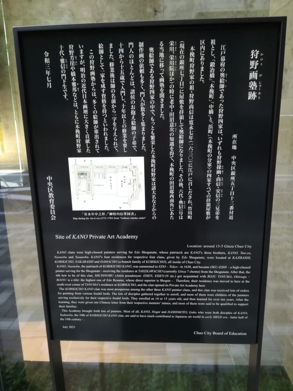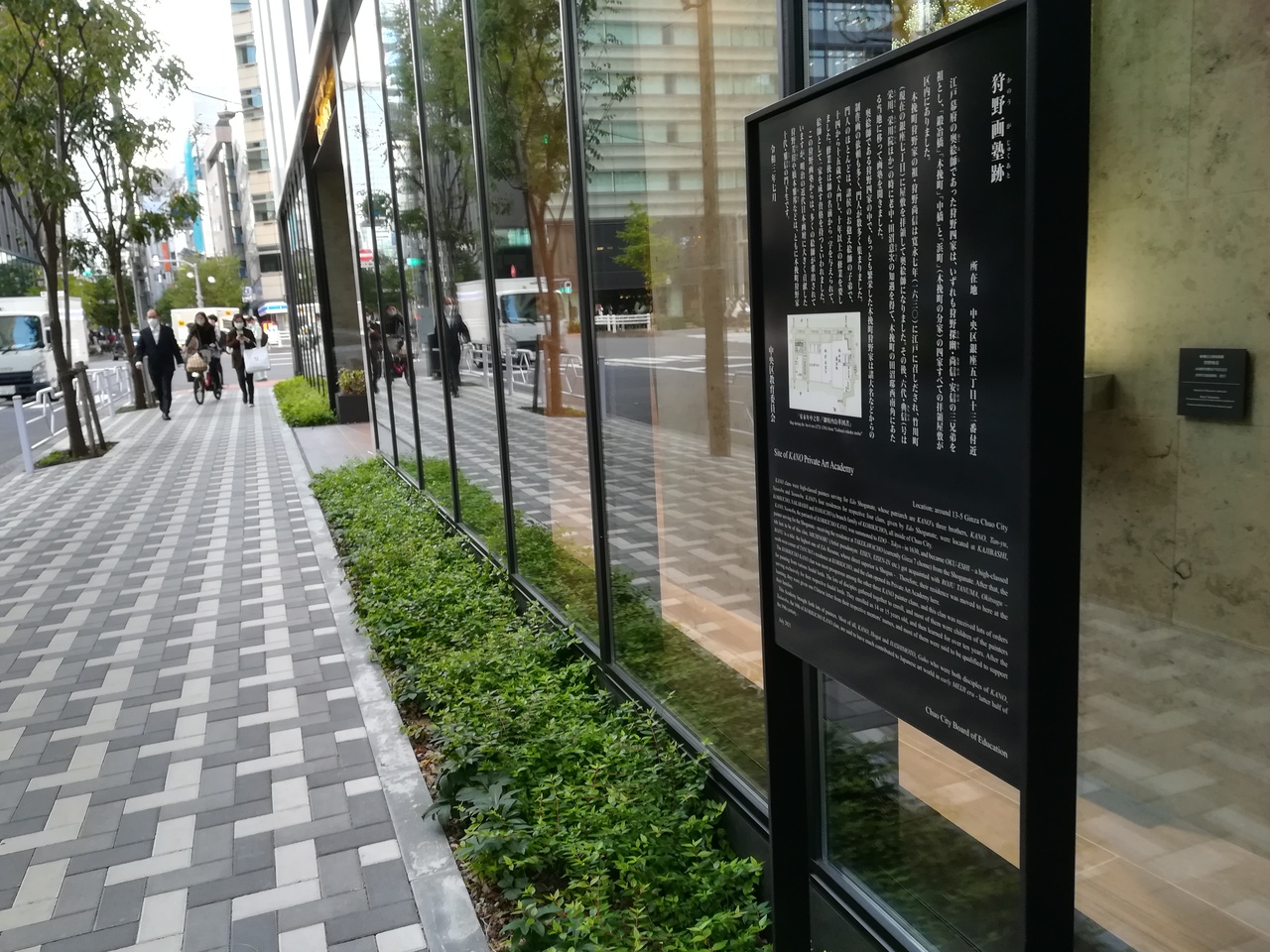 江戸時代の奥絵師であった、狩野四家のひとつの、木挽町狩野家がこちらに、画塾を開いたそうです。東銀座交差点近くですが、