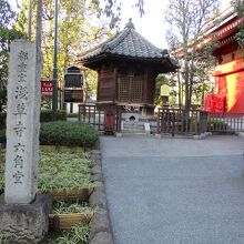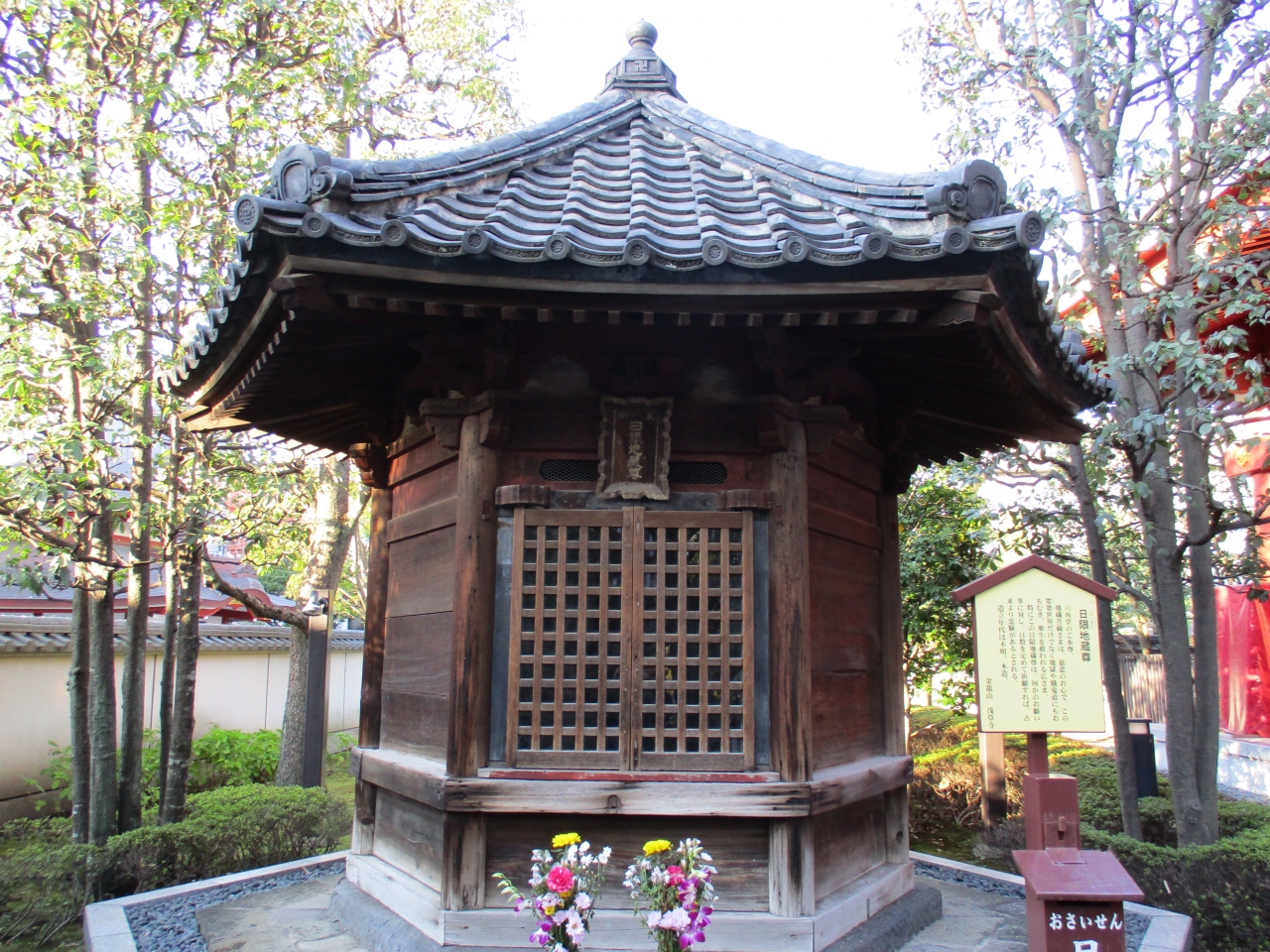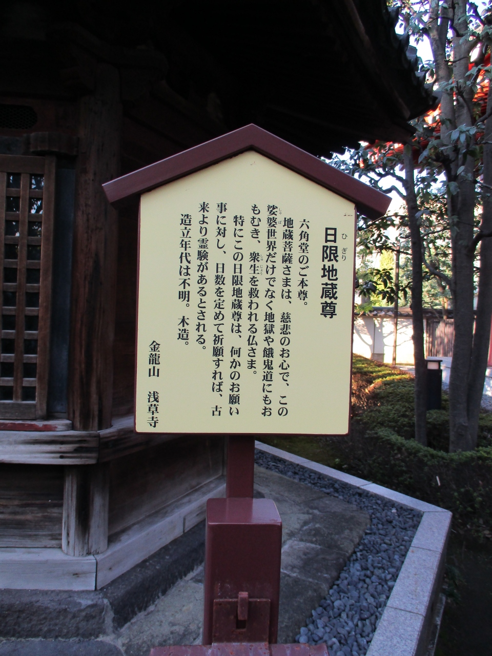 浅草寺の境内を散策していて、石碑とともに瓦葺の小さなお堂がありました。六角形の建物で、お堂の中には日限地蔵尊が祀られているようです。目を凝らして覗き込みましたが、残念ながら中が暗いのでお姿を確認することは出来ませんでした。