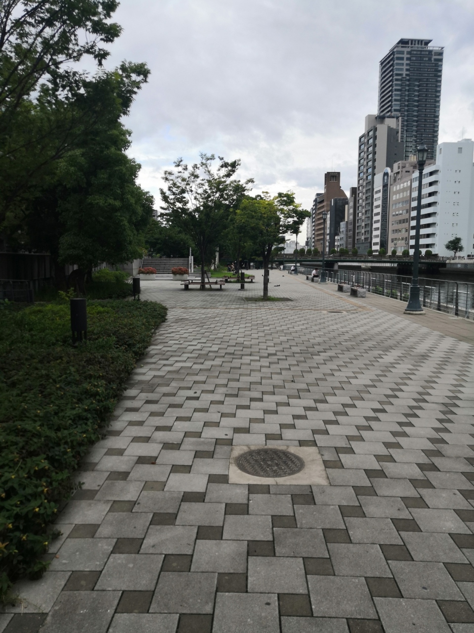 大阪市役所の南側にあるケヤキ並木の遊歩道のことです。平日の夕方だったので近辺は帰宅を急ぐサラリーマンでいっぱいだったのですが、こちらに来ると閑散としていました。土佐堀川沿いから淀屋橋も望めて雰囲気悪くなかったです。