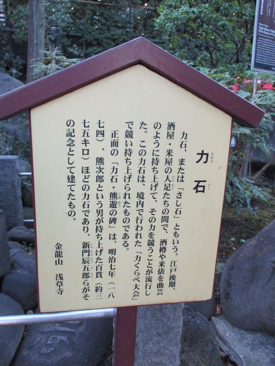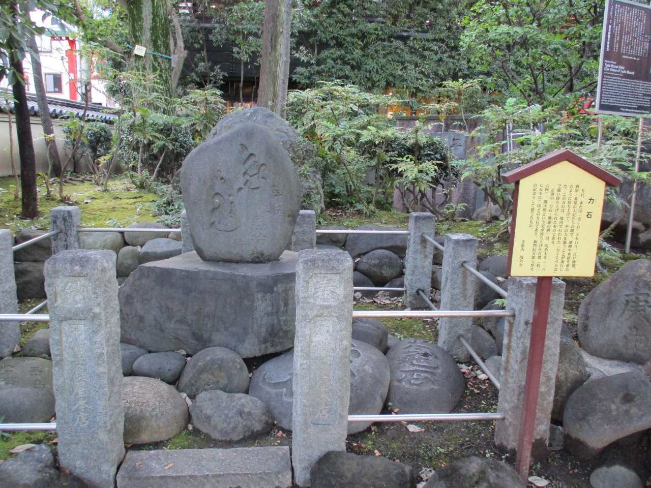 浅草寺の敷地内を散策していて、新奥山という場所の一角に、力石が置かれていました。力自慢が持ち上げた石がいくつも置かれていて、一番大きいのは百貫あるそうです。きっと体格の良い大男が持ち上げたのだろうと想像を膨らませることが出来ました。