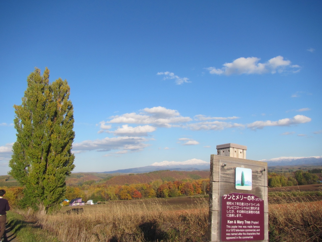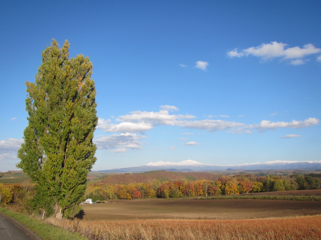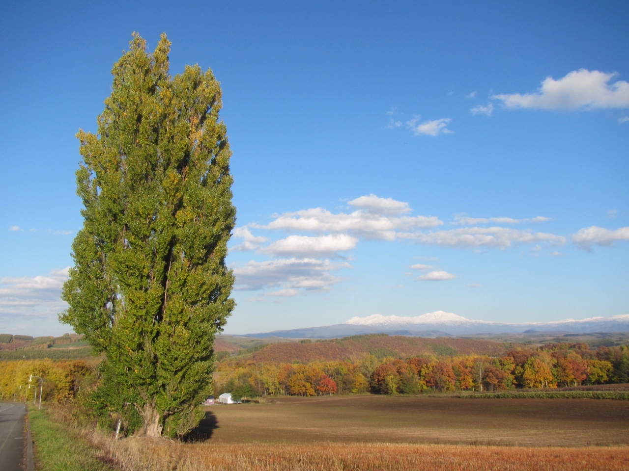 景色は、或る方向から木を眺めると、木の背後のうねる丘の畑の向こうに十勝岳連峰が見えて良いのですが、周辺の道路や建物が気になります。