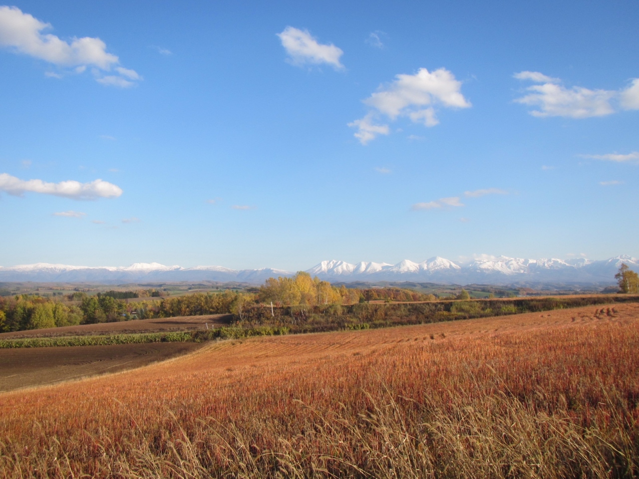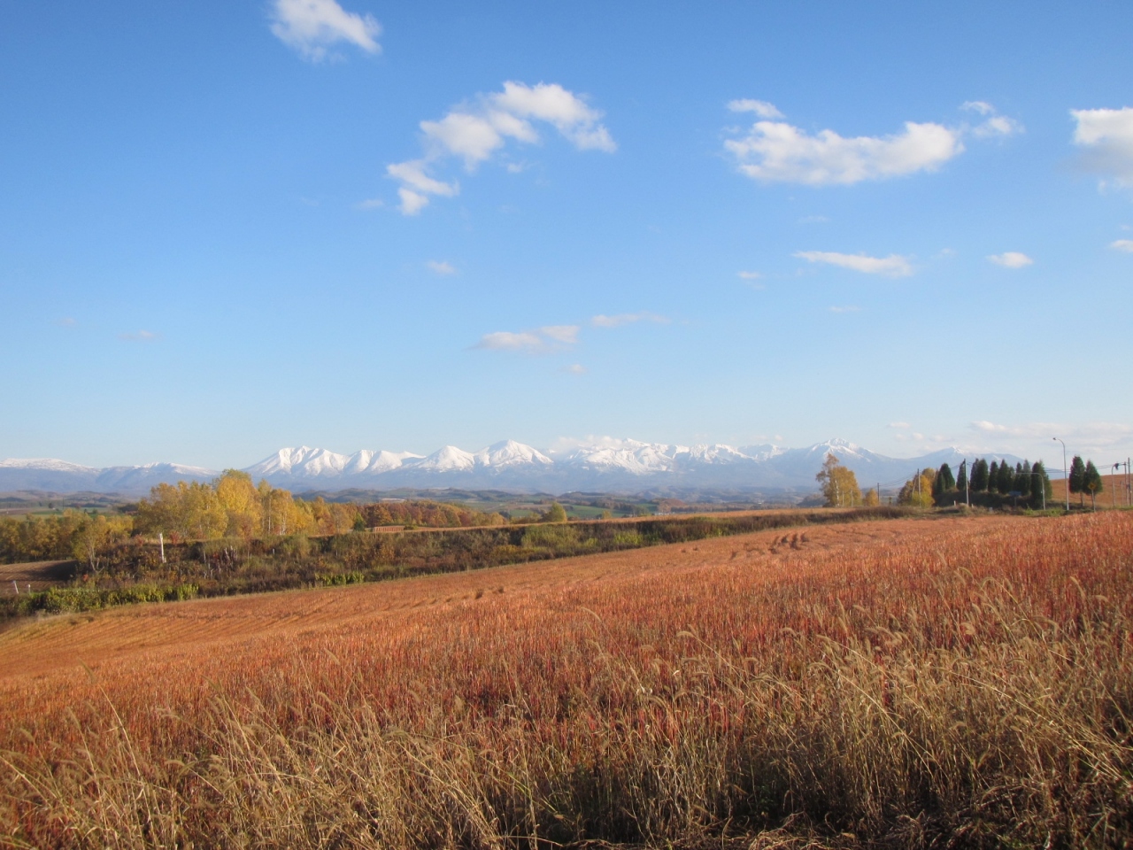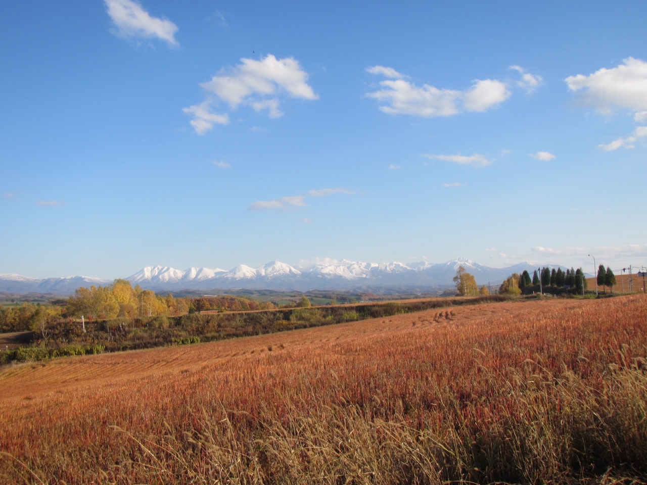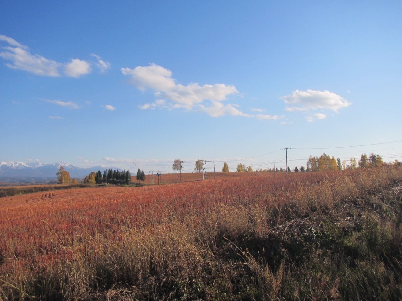 景色は、或る方向から木を眺めると、木の背後のうねる丘の畑の向こうに十勝岳連峰が見えて良いのですが、周辺の道路や建物が気になります。