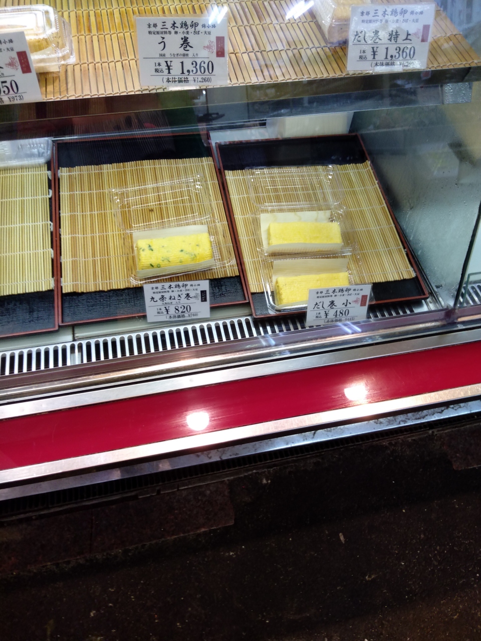錦市場の一角にある卵焼きのお店。卵焼きといっても、京都らしくだし巻き卵を扱っています。店頭にだし巻きがおかれています。平日夕方、しまるような時間だったのもあって、店頭にもあんまり並んでいなかった。シンプルなものから具入りまでいろいろだし巻きでも販売されています。だしのやさしいお味。