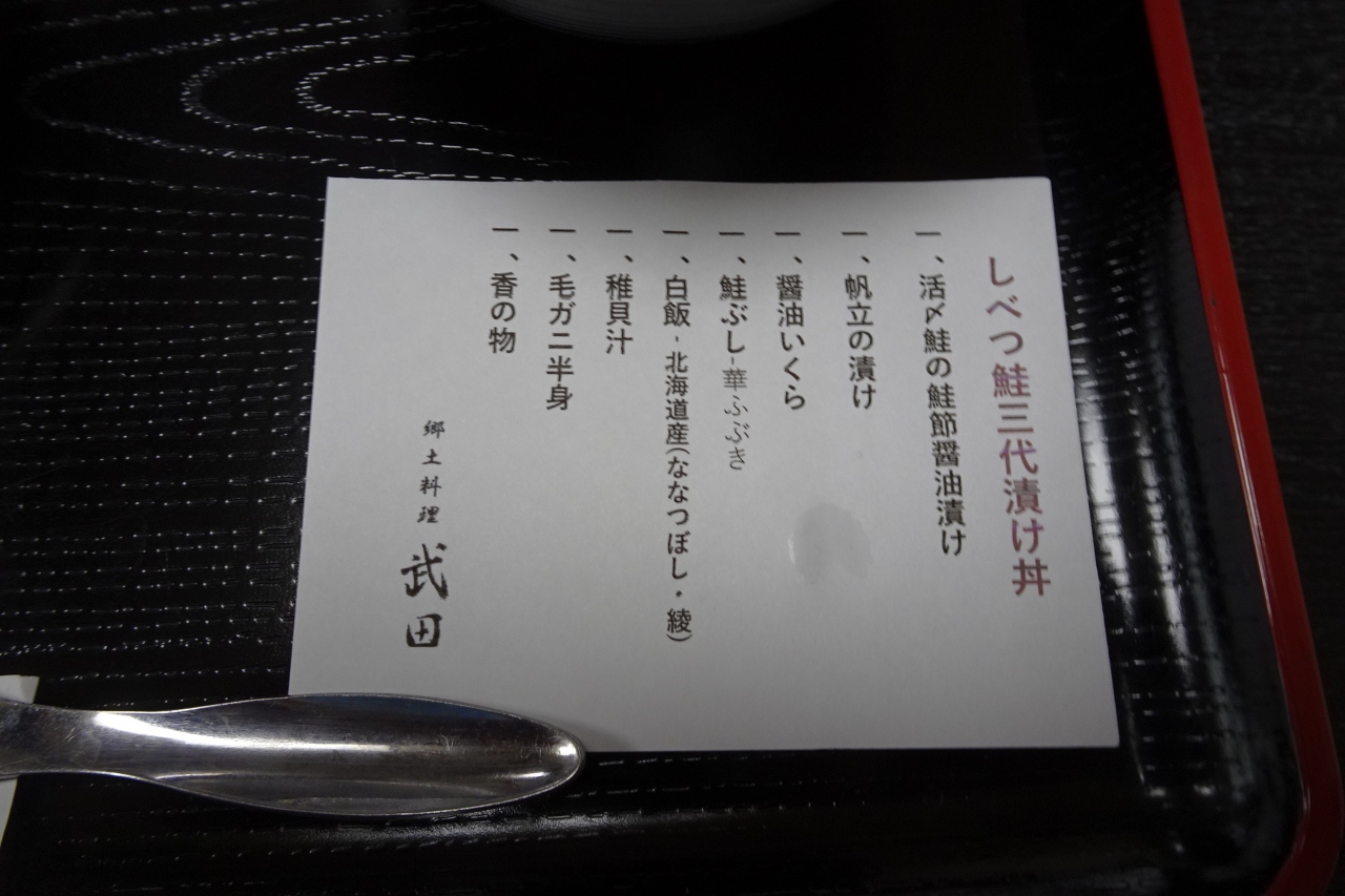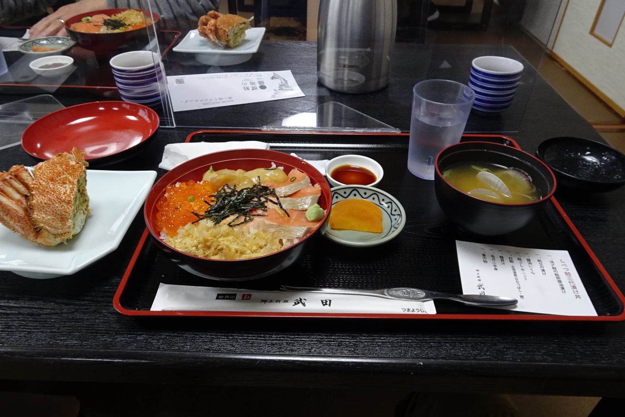 毛ガニ半身と鮭・ホタテの漬け、いくら、鮭ぶしの海鮮丼をいただきました。