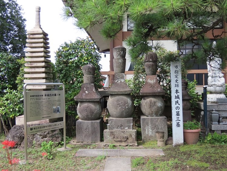 前橋市の指定史跡です。本城氏は最上義光の家臣で出羽に領地を持っていたが、主君の改易後、前橋の酒井家に身を寄せたそうで、以来一族の墓が長昌寺に残されています。もともとは初代・本城満茂から一族19基の墓石があったそうですが、現在残されているのは三基のみ。戦国時代を生きた武士一族の墓ということで価値があるようです。