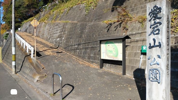 飯坂温泉駅から徒歩10分ほどのところにある公園。愛宕山という小さな丘が公園になっている。頂上へは急な階段か巻くように登る坂道がある。